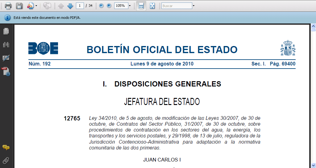 Ley 34/2010, de 5 de agosto, de modificación de las Leyes 30/2007 y 31/2007